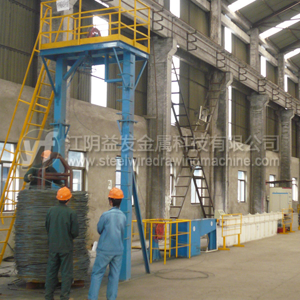 放線架是將原料無(wú)動(dòng)力(被動(dòng)放出),粗線(?8mm)以上通常采用“一”字式放線架,優(yōu)點(diǎn)在于放線不停車(chē)、操作高度較低比較安全。中線(≤6.5mm)推薦采用液壓式高架放線,優(yōu)點(diǎn)在于節(jié)約場(chǎng)地、放線不停車(chē)、高度達(dá)到9米以上時(shí)亂絲非常少;但是對(duì)于這個(gè)直徑的高碳鋼絲而言,鴨嘴式放線架雖然使用場(chǎng)地比較大,效果也可以的。細(xì)絲的放線一般用上抽式放線架,尤其對(duì)于退火后的細(xì)絲,就必須使用一些特殊的裝置才能確保亂絲少。工字輪放線是*好的方式,但是因?yàn)橛猛镜南拗疲@種方式不能全部使用。